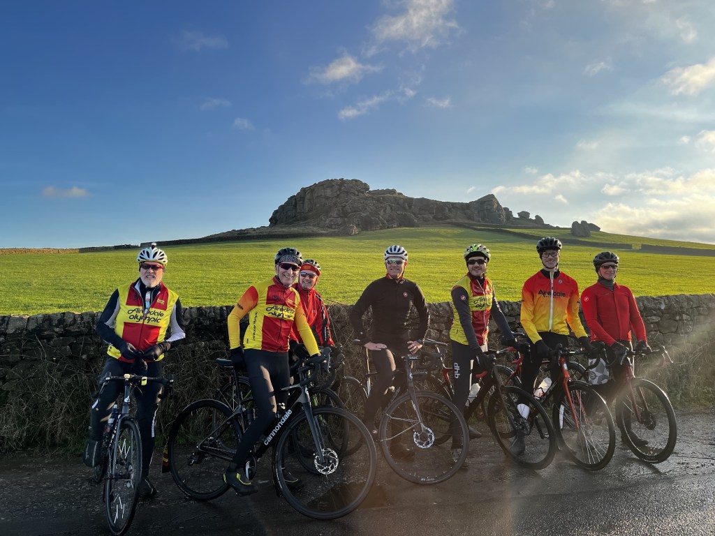 On an unexpectedly sunny Saturday morning, eight riders met up for a 60(ish) mile ride to Ripon. Two groups were formed and after a brief photo opportunity at Armscliffe Crag we parted ways. Four rode at SRAN pace and four at an AIR pace.