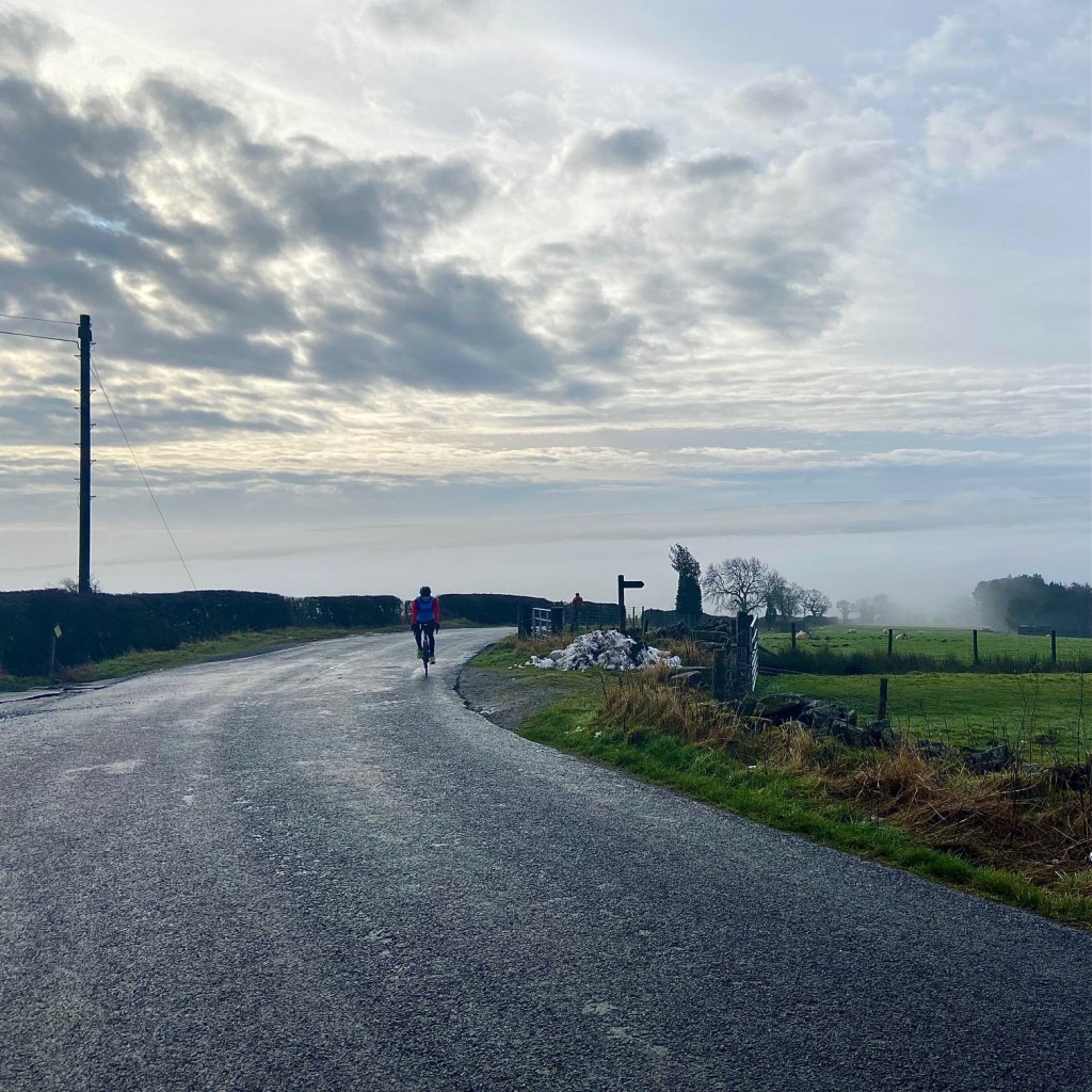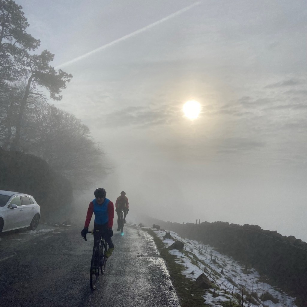 6 set off from a cold and misty Rawdon for ‘Buffers’ Cafe , now ‘Back o the hill farm cafe’, the spiritual home of Airedale Olympic. It was a shorter ride as most were helping out on Sunday at the club’s Reliability Ride. As the temperature dropped and the mist persisted, we headed out of Ilkley for Langbar coming out of the mist into sunshine as we reached the top of the moor. Langbar was misty but very atmospheric. Dom leaving us as Beamsley to head up to Burnsall for a longer ride. Arriving at the cafe we had it and the warming log burner to ourselves.