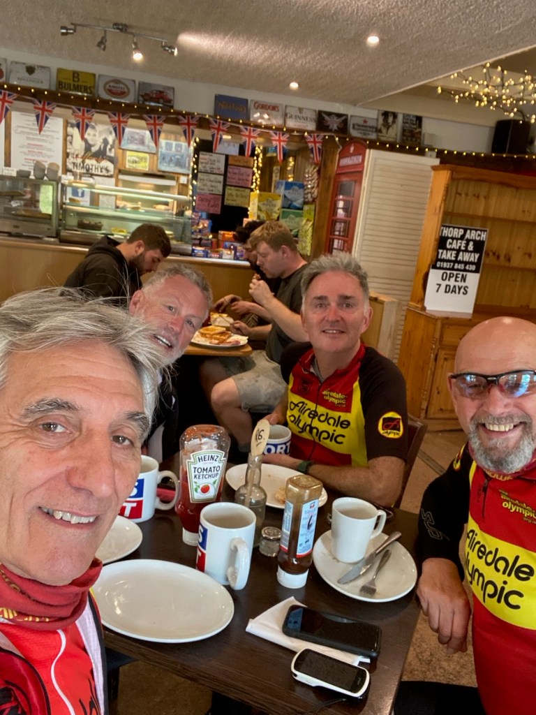 Setting off in unseasonally cool, overcast June weather and heading out via Castley, Kirby Overblow and Sicklinghall to Wetherby and with a slight tail wind we made good progress onto our stop at Tim’s cafe. Always a good stop when a pint mug of tea and a BIG bacon & egg sandwich costs under £7.