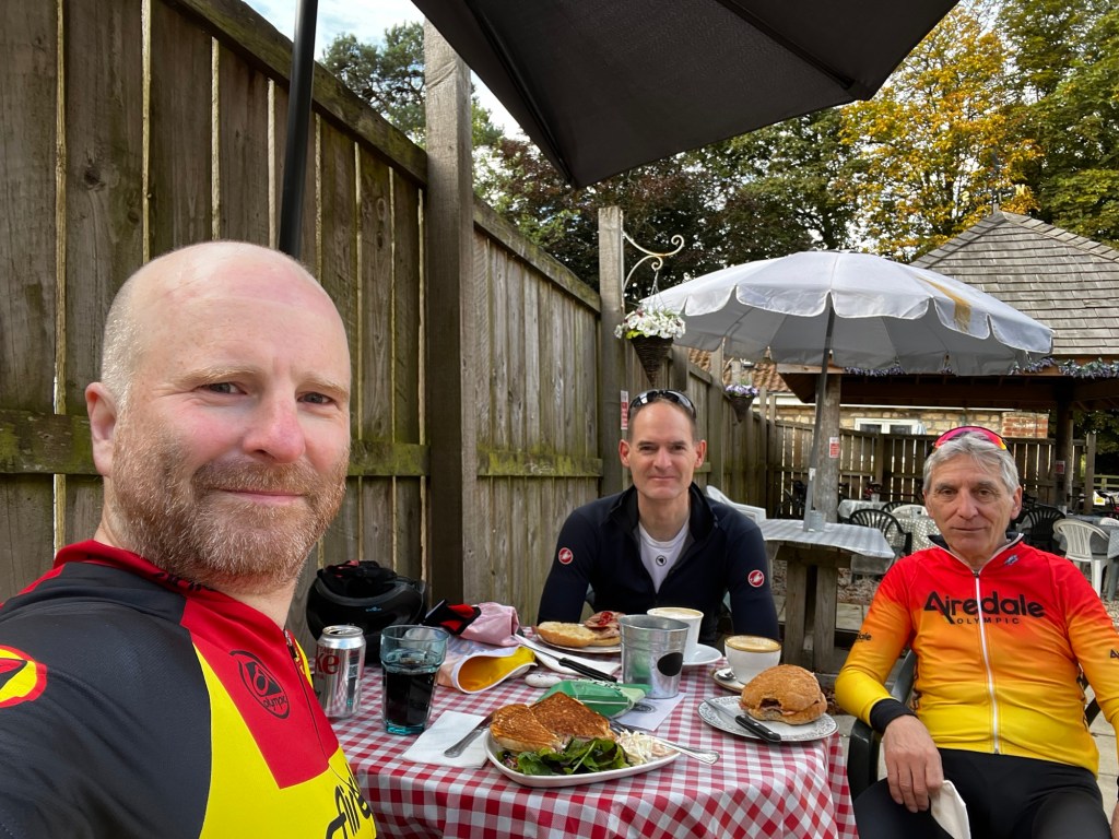 We sat outside and just as we finished eating Hamish turned up, having completed a longer route to the cafe. Ian proposed a second drink so we settled back down for another 20 minutes.