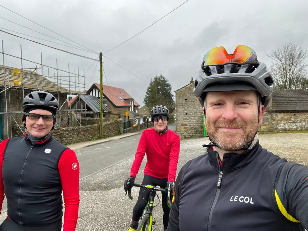 Numbers were low for an overcast ride to Harrogate. However, it was a welcome sight to arrive in Rawdon and see Dan waiting for us after several weeks recovering from a nasty crash.