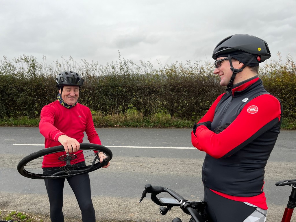 Jonathan got a puncture just outside Pool and managed to beat the record for the slowest puncture repair on an AIR ride. (Excuses included the tyre being too tight, poor eyesight and I am sure being heckled didn’t help either.)