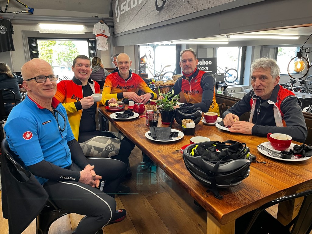 The remaining six riders arrived at the cafe and watched Ian run off to gaze longingly at some expensive carbon (but not before confiscating his credit cards).