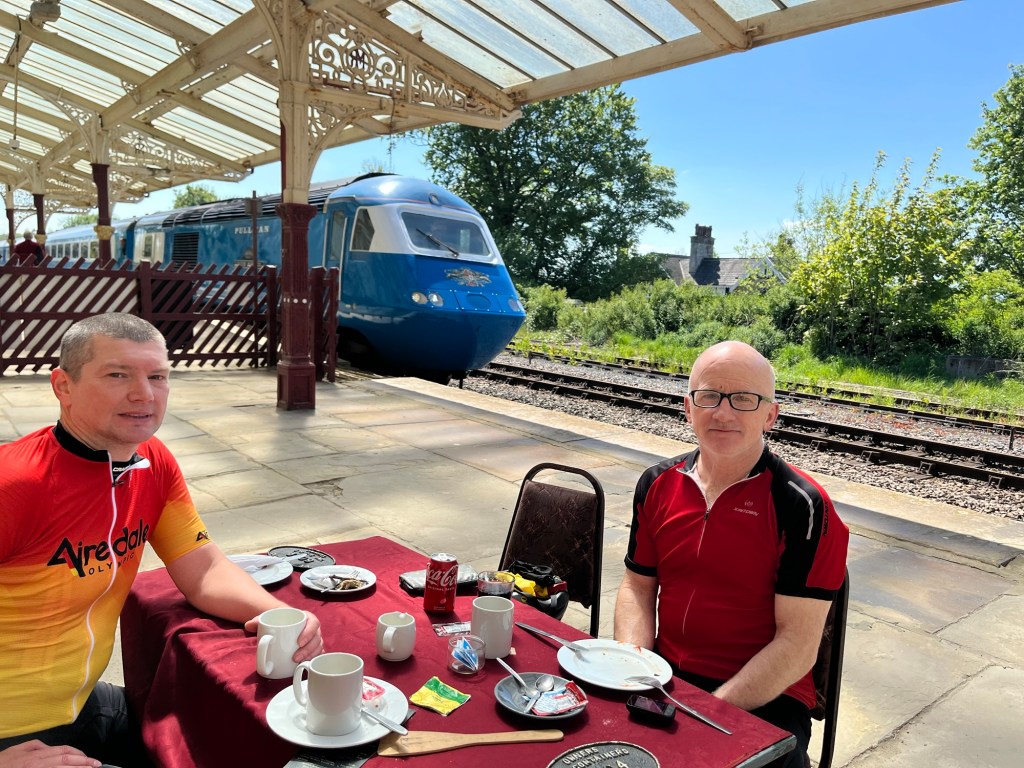 Andre, Dan and Hamish continued out into the sticks and around to Hellifield Station for our cafe stop at the Shed 24H vintage tea room at Hellifield Station. We were debating whether such a vintage cafe would offer gluten free options (they do) and whether we might see a train, when the bright blue Midland Pullman came through with a tuneful honk of the horn for the handful of spotters on the platform. We learned that this was a luxury train on-route from Cardiff to Carlisle.