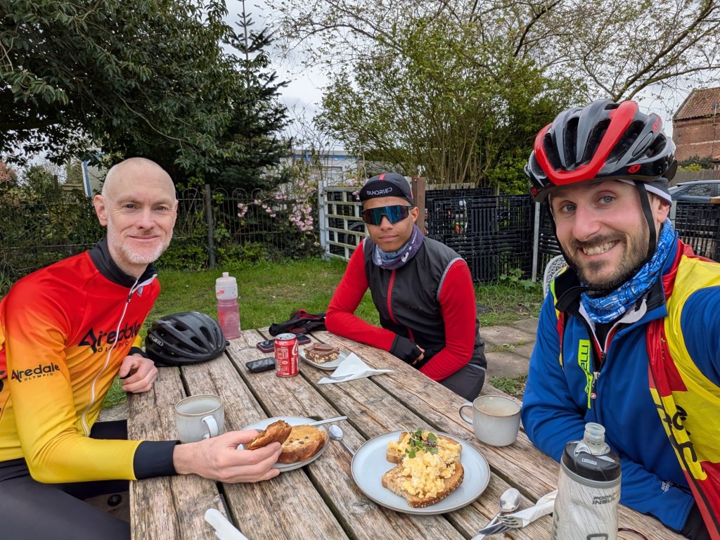 Thirty miles in, the stop was well earned. We sat outside and refuelled. Eggs on toast for David, a toasted teacake for Hamish, and a rocky road for Ryan. Decisions that, in hindsight, may not have been entirely performance-driven.